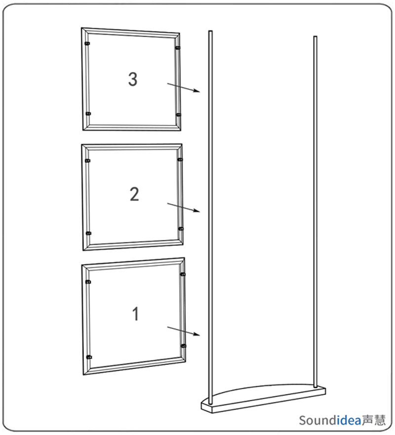 4、请按下图中1、2、3的顺序安装声学模块,声学模块和底座之间,声学模块彼此之间都要贴紧,不要留缝隙,如下图: