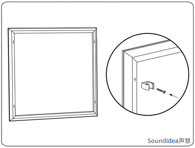 2、用附送的螺丝钉将安装卡扣固定到声学模块背后的边框上,每个声学模块配有4个安装卡扣,请按下图位置安装: