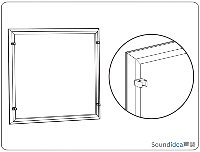 2、用螺丝钉将安装卡扣固定到声学模块背后的边框上,每个声学模块配有4个安装卡扣,请按下图位置安装: